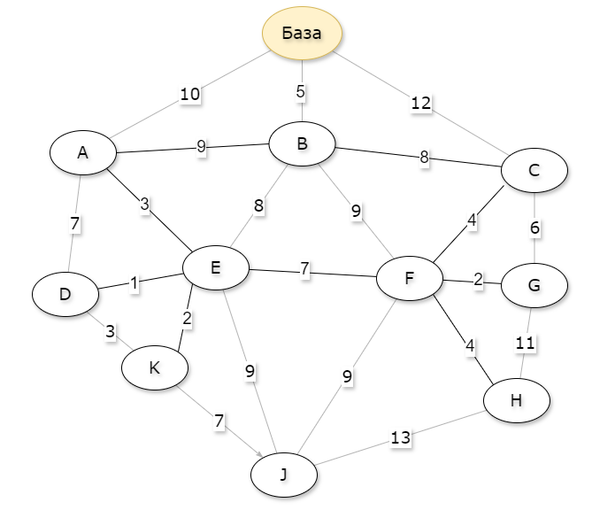 он там. маршрут: Base - A - D - K - J - E - B - F - H - G - C Итого прошел через все точки по одному разу, никакие дорожки дважды не проходил, всего 10 + 7 + 3 + 7 + 9 + 8 + 9 + 4 + 11 + 6 = 74 км.